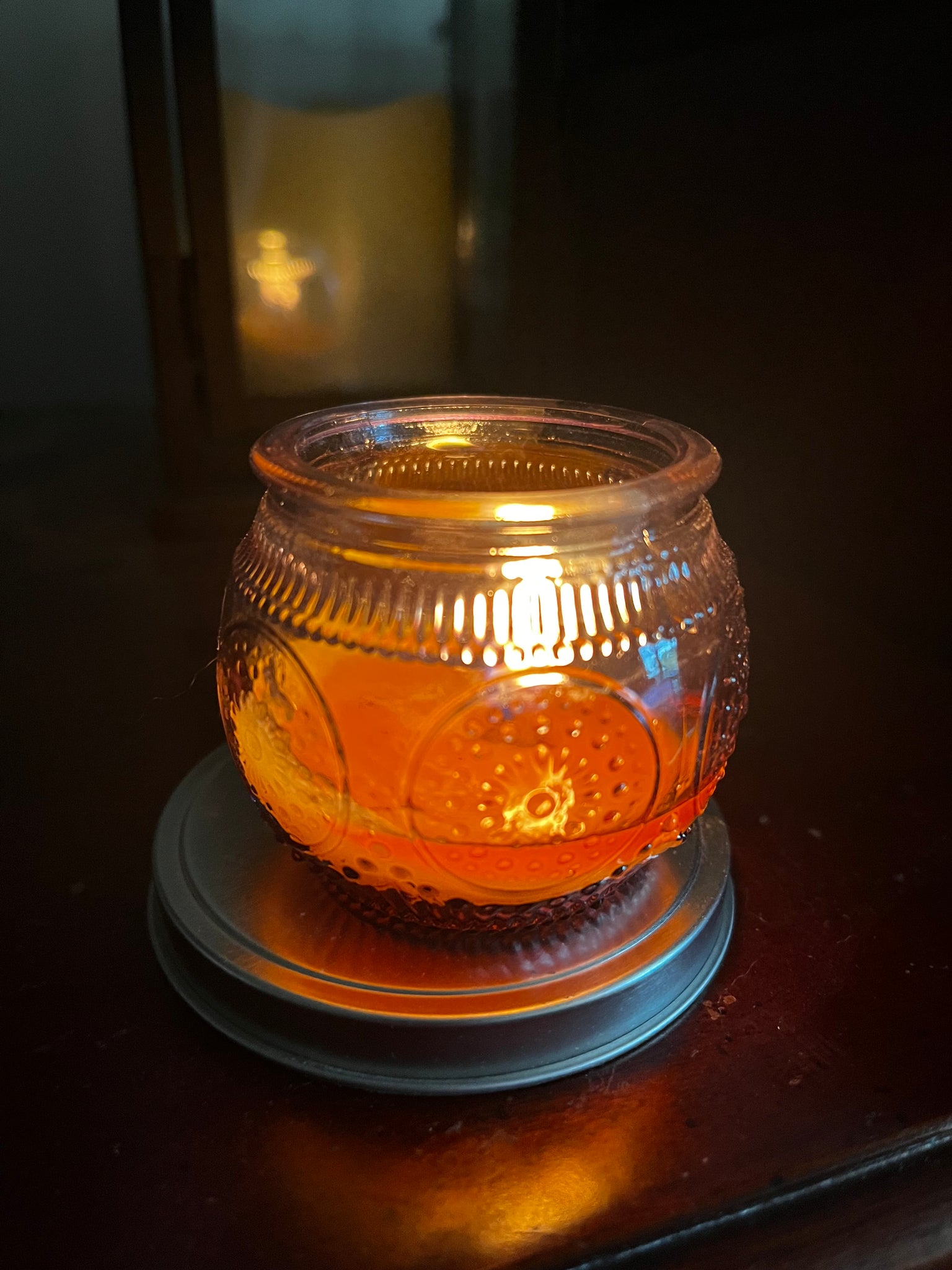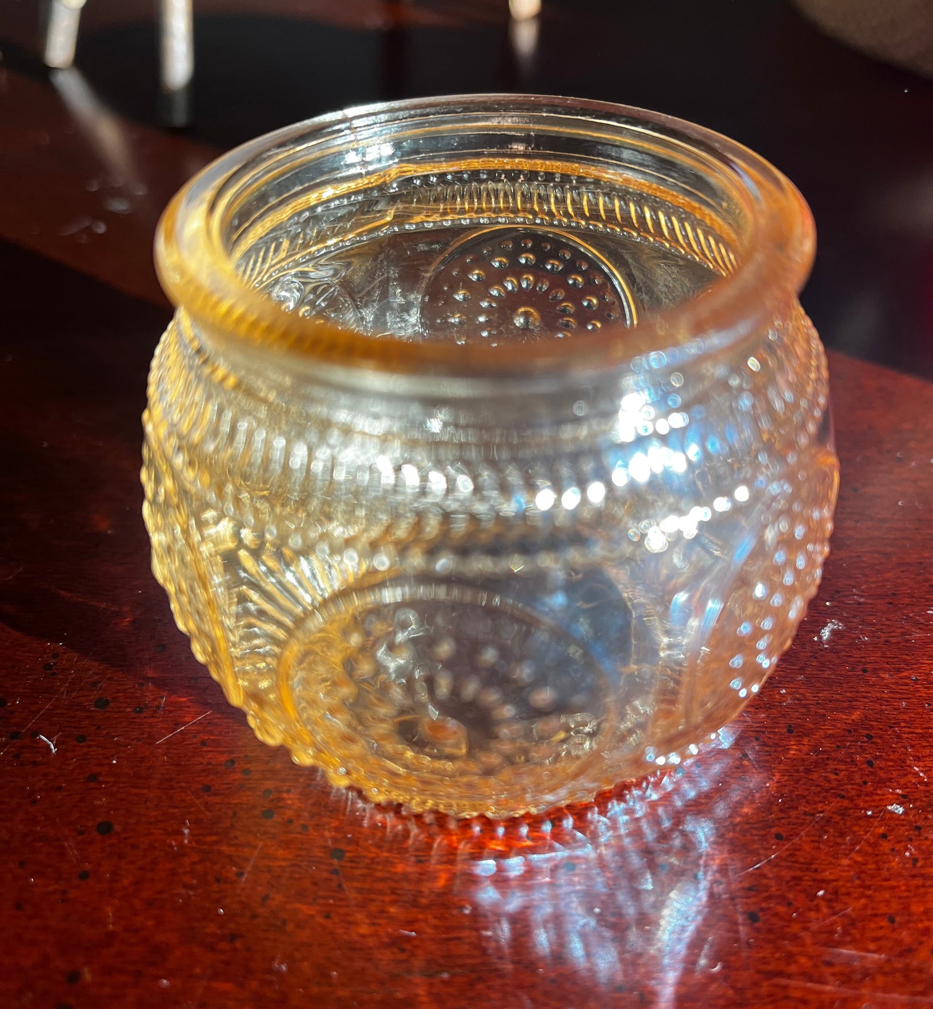 Pure beeswax candle with lead free organic cotton wick in a beautiful, iridescent patterned glass votive!